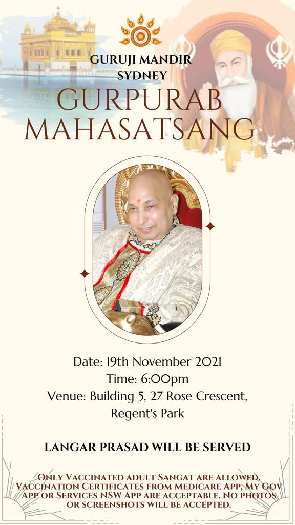 November 19, 2021 @ 6:00 PM - 8:30 PM UTC+10 Gurpurab Mahasatsang at Guruji Mandir Sydney Guruji Mandir Sydney 27 Rose Cres, Regents Park NSW 2144,, Sydney …